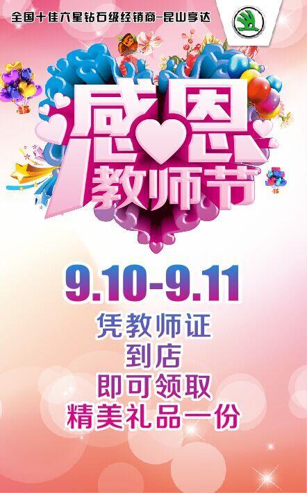 昆山享達斯柯達爲了感恩回饋新老客戶,凡是在學去2016年9月10日-11日來店客戶,憑教師資格證可以領取教師節精美禮品一份朋紙,數量有限,先到先得!