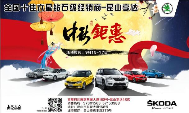 又是一年中秋佳節,每逢佳節倍思親,吃月餅賞月,最重要的還(hái歌醫)是要回家過(guò)個團圓節,昆山享達斯柯達助你圓夢,全系車型票分限時(shí)大促,放“價”到底,絕不讓你空手而歸!