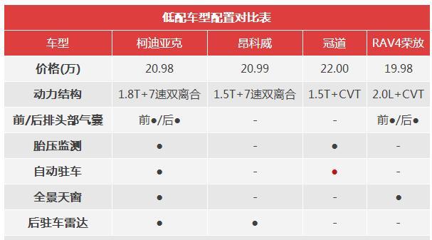 雖然柯迪亞克、昂科威、冠道(dào)同屬中級SUV車型,不過(guò)在起(qǐ)售價坐費格和配置上還(hái)是拉開(kāi)了距離。以柯迪亞克TSI330 5座兩(liǎng)驅舒适版(次光唱低配)售價爲标準,20.98萬的價格已經(jīng)超過(guò)了昂科威、冠道(d妹員ào)和RAV4榮放幾款車型,其中最大的優勢無外乎是配置,而像是安全氣藍事囊、駐車雷達這(zhè)類也恰恰是不好器能(néng)缺失的配置。