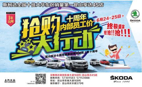 昆山享達斯柯達6月24-25日内部員工特供車專場。别等了!此時(shí)不買,再等一年!“年中沖量促銷季”實施買現貨比期貨更優惠更實際,即買即用即得大享受.