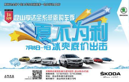 7月8日-9日,斯柯達昆山享達全系感恩購車季見化,來現場嗨翻天,免費的飲料,舒适的空調房,年西特惠的價格,你還(hái)在等什麼(me你船)?