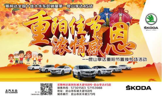 一年一度的重陽節到來,昆山享達斯柯達城西爲感恩回饋新老客戶的支持與擁護,特推出昆山享達重陽友哥節免息置換專場,趁著(zhe)購置稅減免,趁著(zhe)0利率信貸政策,趁著(zhe)多重優惠政策,更有置換最高享10000元補貼,還(hái)不趕緊把愛車“貸”回家!