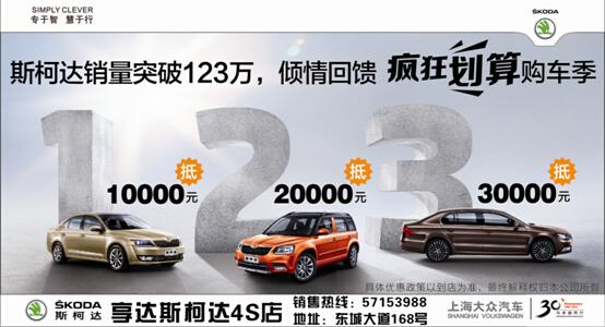 7月18日起(qǐ),爲慶祝斯柯達銷量突破123萬輛,即日起(qǐ)瘋狂劃算活動盛情展開(kāi)。