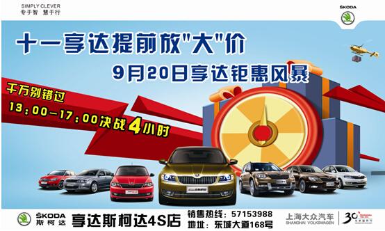 是不是在爲錯過(guò)了9月的大型車展而後(hòu)悔!接下來隻能(n答熱éng)苦苦等待十一車展,期待那時(shí)的價格肯定是最優惠的,那您真的OUT了,享達斯柯達即將(jiāng)帶來特别的驚喜, 9月20日下午13:00-17:00決戰4小時(shí),位于東城大道(dào)168号的享達斯柯達4S店將(jiāng)攜钜惠風暴席卷而來!享達斯柯達劇場提前引爆十一車展優惠。讓您提前享受钜惠,又能(紅用néng)圓十一長(cháng)假出行錯知計劃。