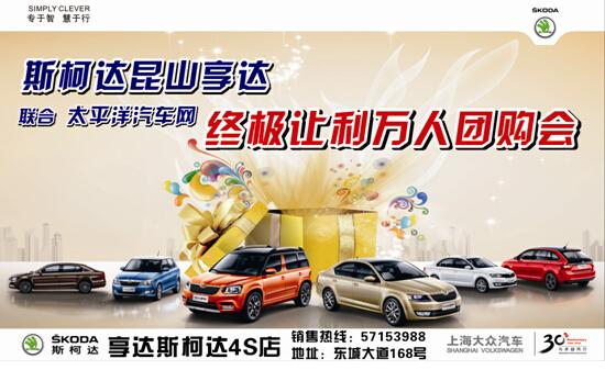 繼十月車展之後(hòu),昆山享達斯柯達首次聯合太平洋汽車網打造終極讓利萬議海人團購會(huì),萬人購車節專場將山術(jiāng)于10月25-26日在昆山世茂廣場隆重登場。