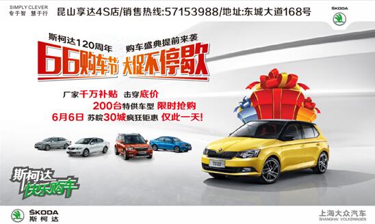 斯柯達120周年,購車盛典提前來襲!6月6日上海大衆廠家爲慶祝斯柯達首款戰略車型-明銳上市8周年,感恩钜惠風暴直擊蘇皖地區,蘇皖30城瘋狂钜惠,廠家千萬補貼,擊穿底明生價! 200台特供車型限時(shí)搶購!僅此一天!