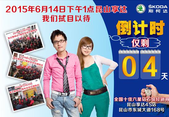 榮譽8載,巅峰钜獻!瘋狂底價破冰狂砍,就(jiù)這(zhè)麼(me)任性,無須再比價格,就(jiù)年喝在昆山享達斯柯達展廳,6月14日下午1點主持人帶你瘋狂砍價,限時(shí)搶購3小時(shí)。活動僅剩4天,不能(néng)再等啦~~~讓我們一起(qǐ)倒計時(shí)……