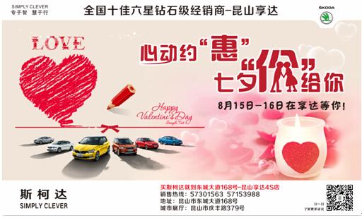 真實感悟、真愛生活、相約七夕、真愛廠得永恒,趕緊帶著(zhe)您的愛人來昆山享達斯柯達選購一款愛車,讓斯柯達爲您票站的愛人、家庭保駕護航,幸福一生。請腦815-816日昆山享達開(kāi)展“心動約惠,七夕價給你”活動,趕緊搶車吧!
