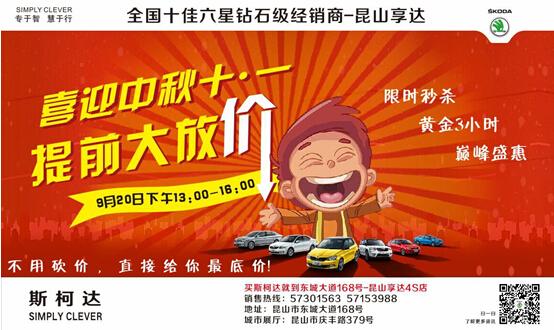 購車何必等十一!不用等到放假,就(jiù)能相日(néng)享受車展優惠價!2015年9月20日下午13:00-16:00昆山享達斯柯達爲您精打細算,不可錯過(guò)的3小時(shí)巅峰盛惠,給你一個立即行動起(qǐ)來搶購愛車的理由!現在你不必苦等“十一”,便可拿到優惠心儀的斯柯達現車