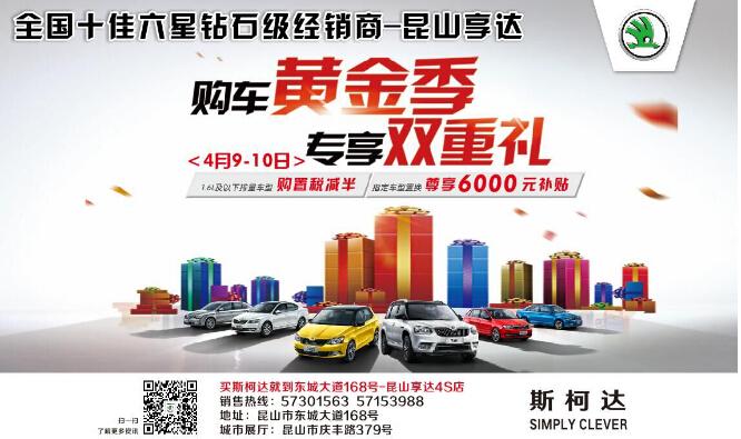 4月正值踏青季,豈可錯過(guò)的購車黃金季,昆山享達周末傾情慢雜巨獻,專享雙重好(hǎo)禮,1.6L及以下配置尊享購置稅減半政策,指定車型置換更有6000元補貼,多重好(hǎo)禮就(jiù)在昆山享達斯柯達,老明活動時(shí)間:4月9日-10日!