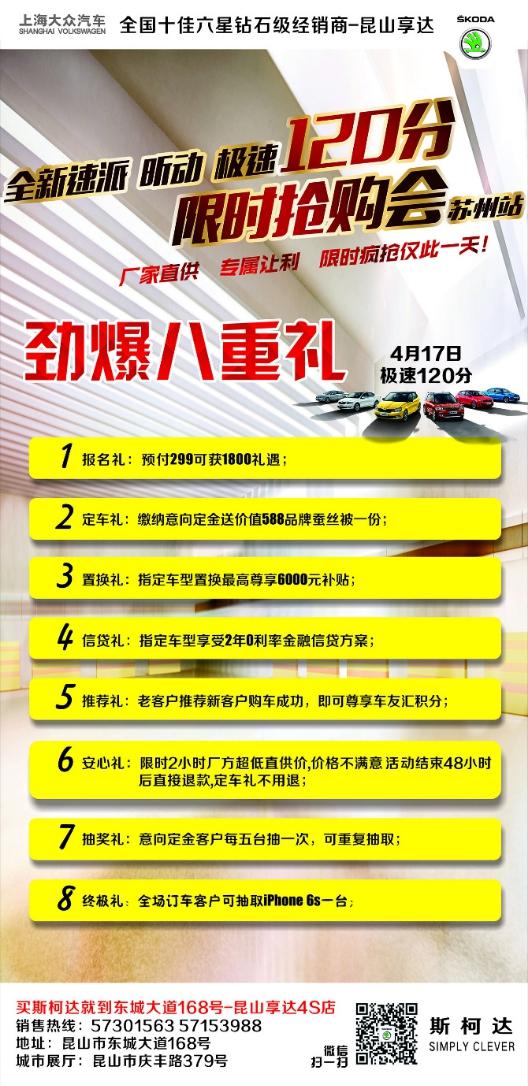 昆山的準車主們,買車福利來啦!【預付299可獲1800禮遇昆山享達聯合廠家直接讓利,全新速派、昕動大型議場工廠内購會(huì),廠家底價出擊,前所未有的優惠力度,真正的廠家特惠,活動僅此一天,就(jiù)在4月17!現場豐厚的訂車禮品,更多樂趣無窮的體驗活動,跟随昆山享達一很照起(qǐ)去蘇州廠家内購會(huì)現場吧!名額有限,速速報名!