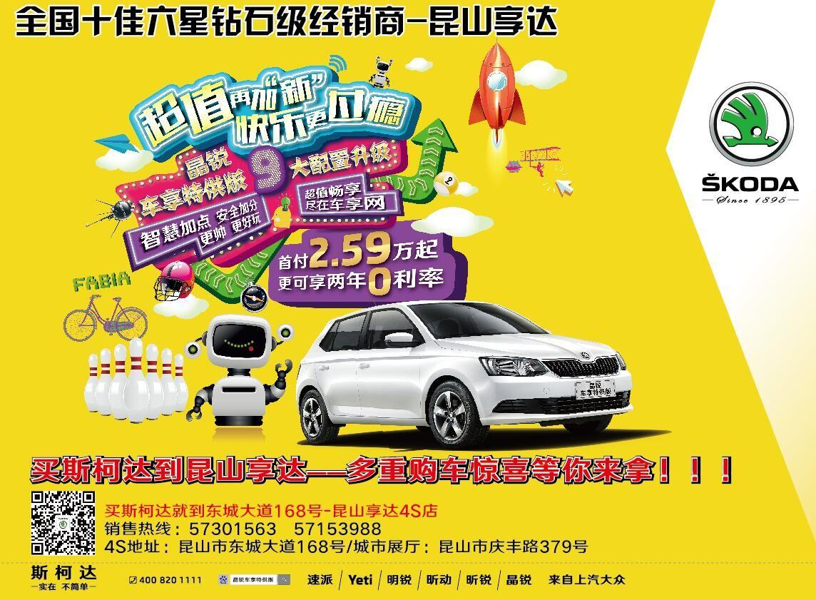 晶銳車享版首付僅需2.59萬,尊享2年0利率信貸政策,3000元置換補貼,多重購車驚喜等你來拿,就(j那物iù)在昆山享達斯柯達!
